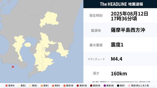 8月12日17時37分頃、宮崎県・鹿児島県で最大震度1の地震を観測