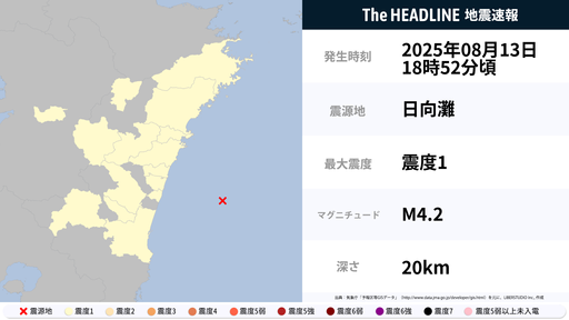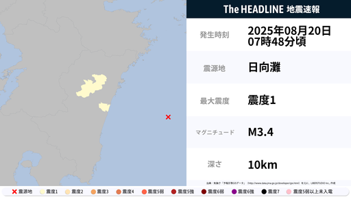 8月20日7時48分頃、宮崎県で最大震度1の地震を観測
