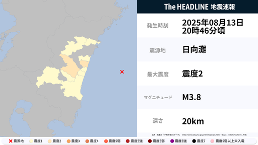 8月13日20時46分頃、宮崎県で最大震度2の地震を観測