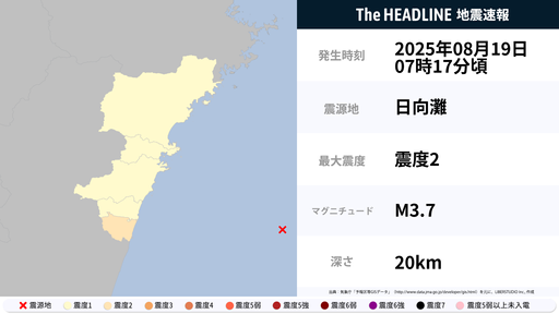 8月19日7時17分頃、宮崎県で最大震度2の地震を観測