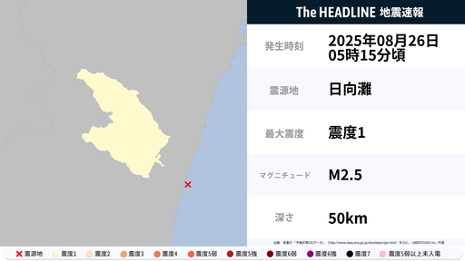 8月26日5時15分頃、宮崎県で最大震度1の地震を観測