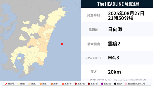 8月27日21時50分頃、宮崎県で最大震度2の地震を観測