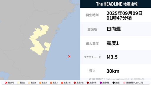 9月9日1時47分頃、宮崎県で最大震度1の地震を観測