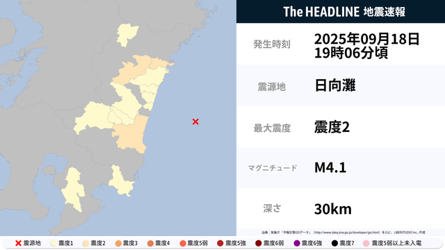 基本情報発生時刻9月18日19時6分震源地日向灘最大震度2マグニチュード4.1深さ 30km北緯32.0度 東経131.9度