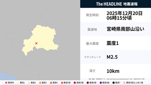 12月20日6時15分頃、宮崎県で最大震度1の地震を観測