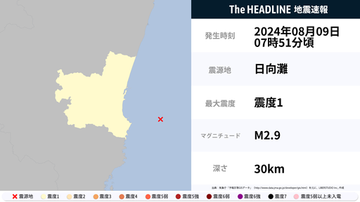 8月9日7時51分頃、宮崎県で最大震度1の地震を観測
