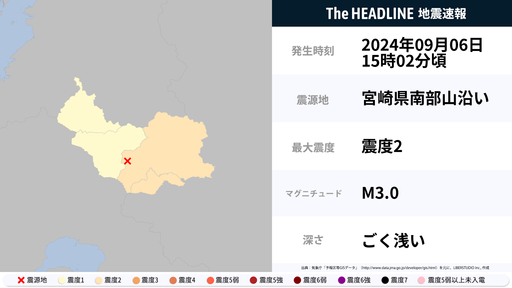 9月6日15時2分頃、宮崎県で最大震度2の地震を観測