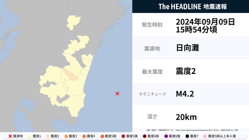 9月9日15時54分頃、宮崎県で最大震度2の地震を観測