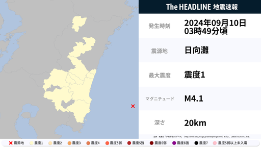 9月10日3時50分頃、宮崎県で最大震度1の地震を観測