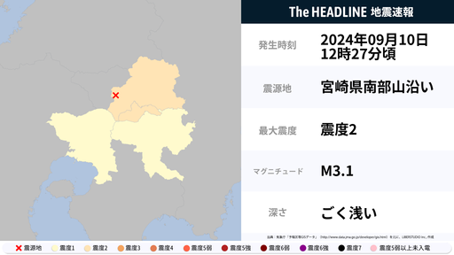 9月10日12時27分頃、宮崎県で最大震度2の地震を観測
