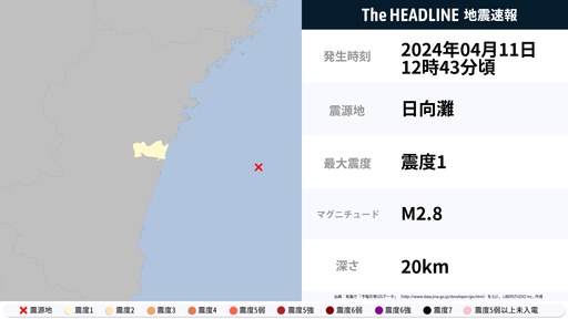 4月11日12時43分頃、宮崎県で最大震度1の地震を観測