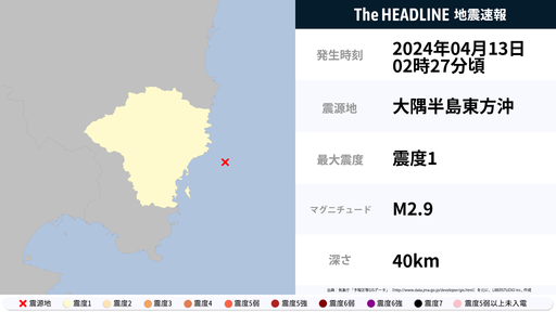 4月13日2時27分頃、宮崎県で最大震度1の地震を観測