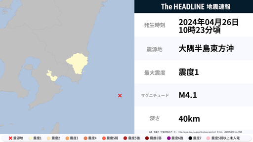 4月26日10時24分頃、宮崎県・鹿児島県で最大震度1の地震を観測