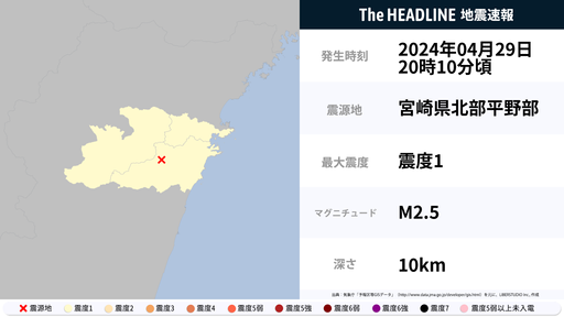 4月29日20時10分頃、宮崎県で最大震度1の地震を観測