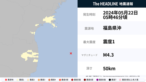 5月22日5時46分頃、宮城県・福島県で最大震度1の地震を観測