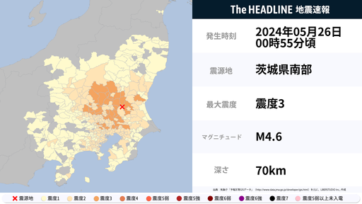 5月26日0時55分頃、茨城県・栃木県などで最大震度3の地震を観測