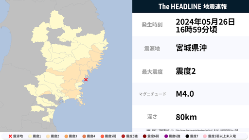 5月26日16時59分頃、岩手県・宮城県で最大震度2の地震を観測