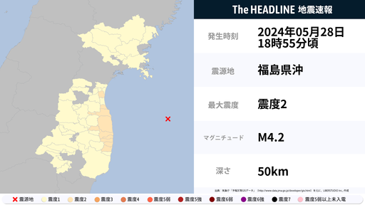 5月28日18時55分頃、宮城県・福島県で最大震度2の地震を観測