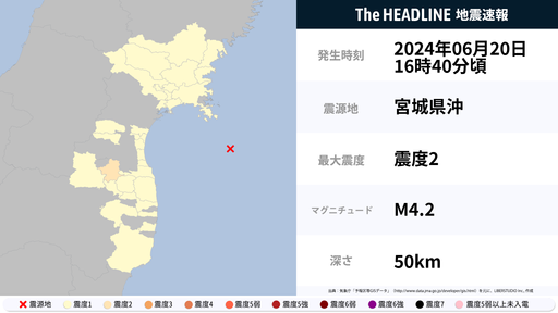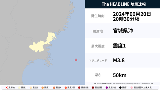 6月20日20時30分頃、宮城県で最大震度1の地震を観測