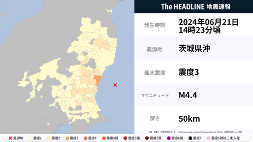 6月21日14時23分頃、茨城県で最大震度3の地震を観測