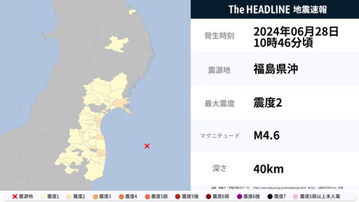 6月28日10時46分頃、宮城県・福島県で最大震度2の地震を観測