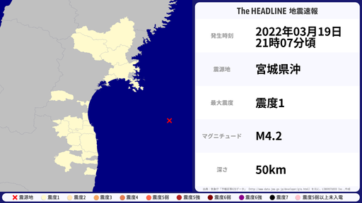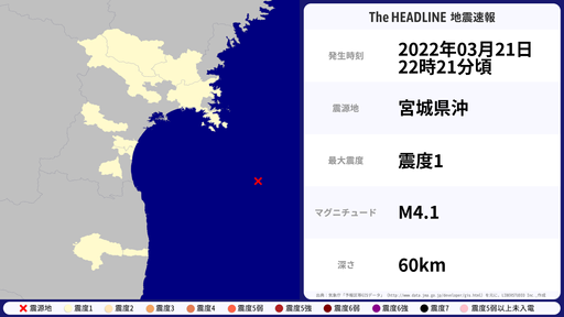 3月21日22時21分頃、宮城県などで最大震度1を観測する地震がありました。
