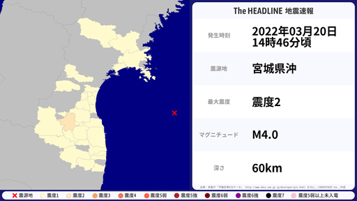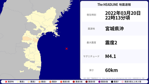 3月20日22時13分頃、宮城県で最大震度2を観測する地震がありました。