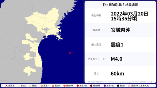 3月20日06時15分頃、宮城県などで最大震度1を観測する地震がありました。