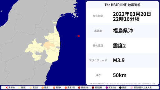 3月20日22時16分頃、福島県で最大震度2を観測する地震がありました。
