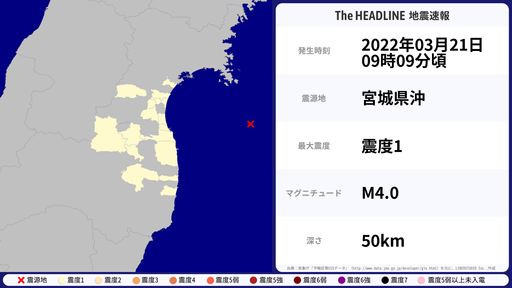 3月21日09時10分頃、宮城県などで最大震度1を観測する地震がありました。