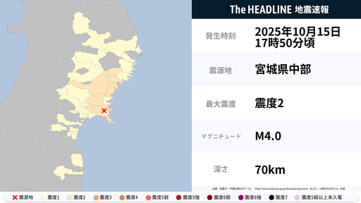10月15日17時50分頃、岩手県・宮城県で最大震度2の地震を観測