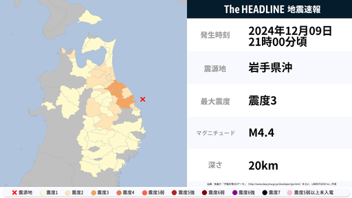 12月9日21時0分頃、青森県・岩手県で最大震度3の地震を観測