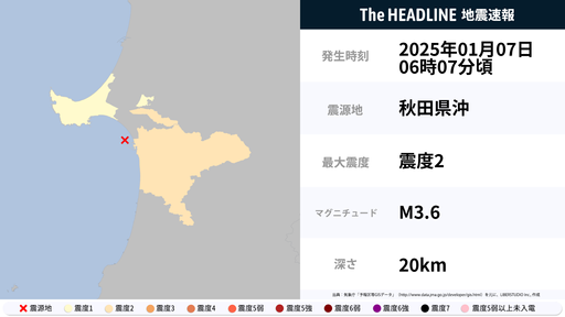 1月7日6時7分頃、秋田県で最大震度2の地震を観測