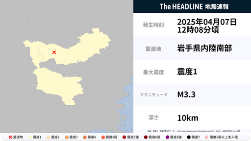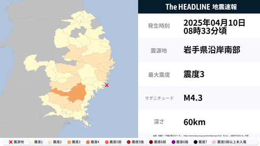 4月10日8時33分頃、岩手県で最大震度3の地震を観測