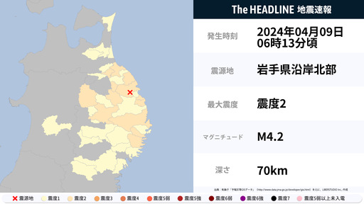 4月9日6時13分頃、青森県・岩手県で最大震度2の地震を観測