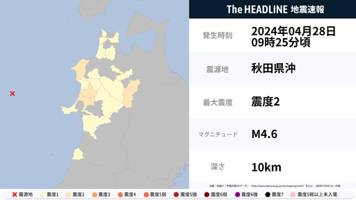 4月28日9時26分頃、青森県・秋田県で最大震度2の地震を観測