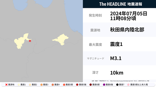 7月5日11時8分頃、青森県・秋田県で最大震度1の地震を観測