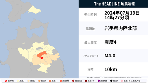7月19日14時27分頃、岩手県で最大震度4の地震を観測