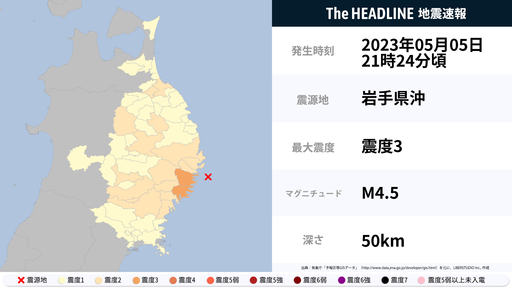 5月5日21時25分頃、岩手県で最大震度3の地震を観測