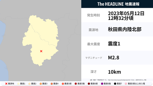 5月12日12時32分頃、秋田県で最大震度1の地震を観測
