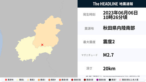 6月6日10時26分頃、秋田県で最大震度2の地震を観測