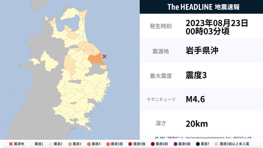 8月23日0時3分頃、岩手県で最大震度3の地震を観測