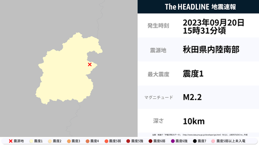 9月20日15時31分頃、秋田県で最大震度1の地震を観測