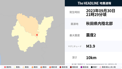 9月30日21時30分頃、秋田県で最大震度2の地震を観測