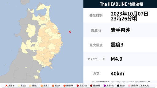 10月7日23時26分頃、岩手県で最大震度3の地震を観測
