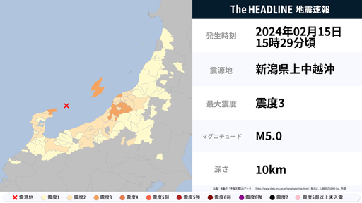 2月15日12時48分頃、新潟県で最大震度3の地震を観測