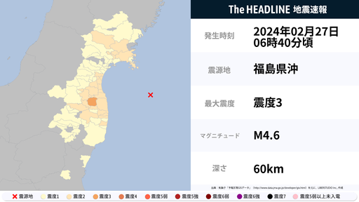 2月27日6時40分頃、福島県で最大震度3の地震を観測