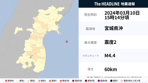 3月10日15時15分頃、宮城県・福島県で最大震度2の地震を観測