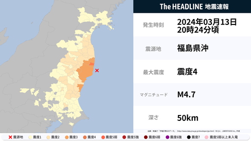 3月13日20時24分頃、福島県で最大震度4の地震を観測