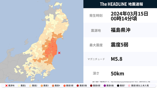 3月15日0時14分頃、福島県で最大震度5弱の地震を観測